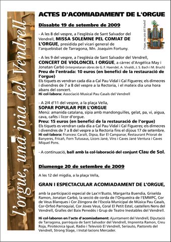 Menú: amanida catalana, sípia amb mandonguilles, gelat, pa, vi, aigua, cava, cafès ¡licor d’orgue. Preu: 15 euros (en benefici de la restauració de I’orgue) Els tiquets es vendran cada dia a Cal Pau Vidal i Cal Figueres; els dimecres i divendres de 7 a 8 del vespre a la Rectoria fins el dijous 17 de setembre.