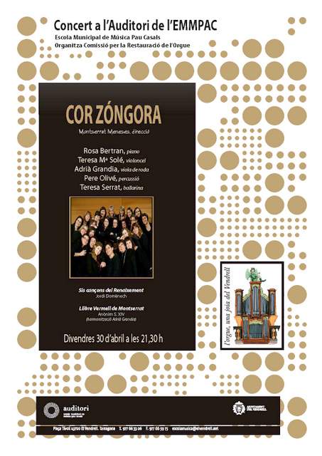 El proper divendres, 30 d’abril, a l’auditori de l’escola Municipal de Música Pau Casals del Vendrell (EMMPAC) hi haurà un concert del Cor Zóngora sota la direcció de Montserrat Meneses.