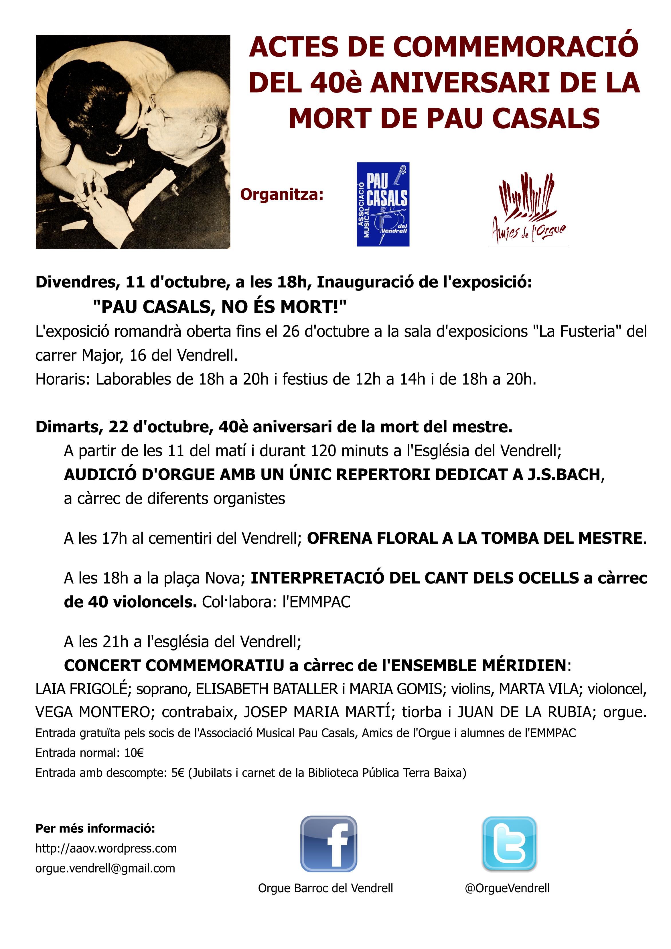 L’Associació Musical Pau Casals i els Amics de l’Orgue ja tenen definits els actes de commemoració el 40è aniversari de la mort de Pau Casals. El divendres 11 d’octubre s’inaugurarà a La Fusteria l’exposició “Pau Casals, no és mort!”, que es podrà visitar fina al 26 d’octubre.