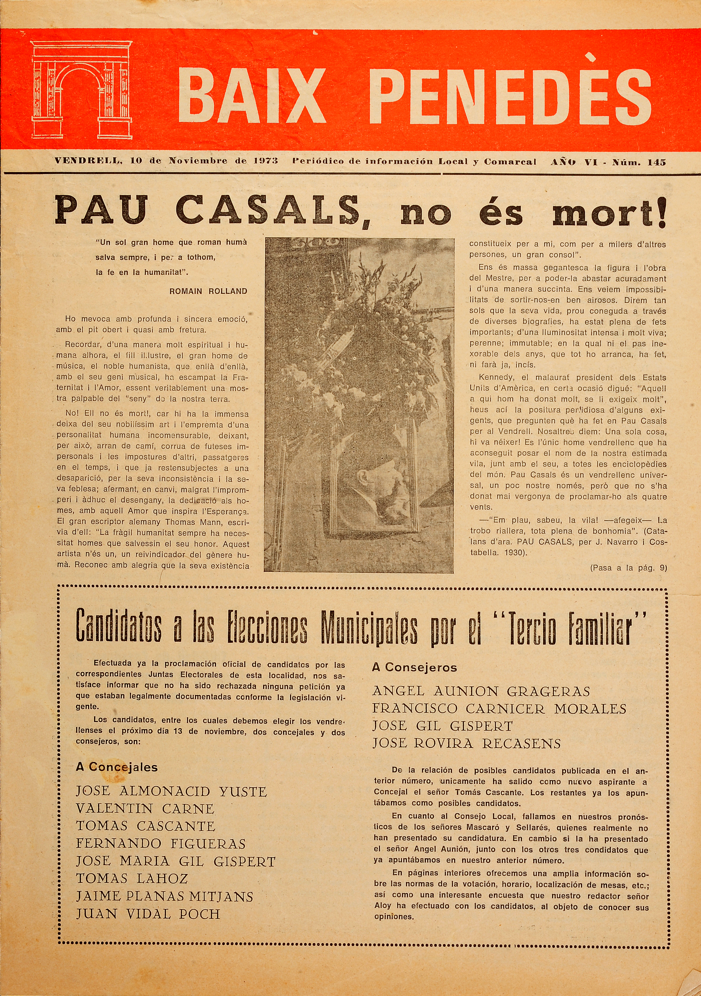 El proper divendres, 11 d’octubre a les 18h a la sala d’exposicions “La fusteria” del carrer major del Vendrell, l’Associació Musical Pau Casals i els Amics de l’Orgue del Vendrell inaugurem l’exposició “Pau Casals no és mort”. Es tracta d’un recull de diferents articles de la premsa en els dies previs i posteriors a la mort de Pau Casals. L’exposició romandrà oberta fins el 26 d’octubre.
