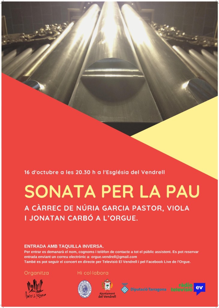 El proper divendres 16 d’octubre a les 20.30 hores a l’església del Vendrell concert a càrrec de la Núria Pastor, viola i Jonatan Carbó, orgue