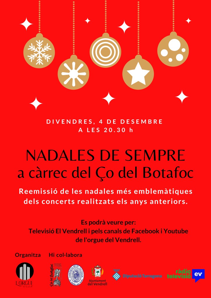 Amb la problemàtica de la COVID-19 de programar concerts presencials, l’Associació d’amics de l’orgue del Vendrell ha decidit fer un retransmissió de les nadales més emblemàtiques dels concerts realitzats en anys anteriors càrrec del Ço de Botafoc, el divendres vinent, 4 de desembre i a les 20:30 hores per la Televisió del Vendrell i pels canals de Facebook i Youtube.