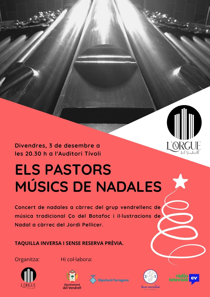 Aquest divendres, dia 3 de desembre de 2021, a les 20.30 h a l’auditori Tívoli tindrem el plaer de tenir un concert de Nadal sota el lema Els pastors músics de nadales a càrrec del grup vendrellenc de música tradicional i popular Ço del Botafoc, i amb unes il·lustracions del repertori del vendrellenc Jordi Pellicer