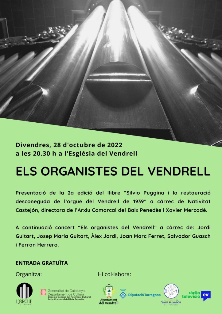Primer tindrà lloc la presentació de la 2a edició del llibre “Silvio Puggina i la restauració desconeguda de l’Orgue del Vendrell de 1939”, obra de Navitat Castejón, directora de l’Arxiu Comarcal del Baix Penedès, i Xavier Mercadé, president de l’Orgue del Vendrell. Es tracta d’una nova edició revisada i actualitzada on els autors expliquen la restauració desconeguda de l’orgue del Vendrell iniciada el 1939 i finalitzada el 1941 per l’orguener italià Silvio Puggina. Motivats per l’escassa informació existent sobre Puggina i el fuster Enrico Rabagliati, els autors han descobert dades importants a partir de l’estudi de la correspondència entre Josefa Bigoni, vídua de Puggina i Pau Casals que es troba dipositada a l’Arxiu Nacional de Catalunya.