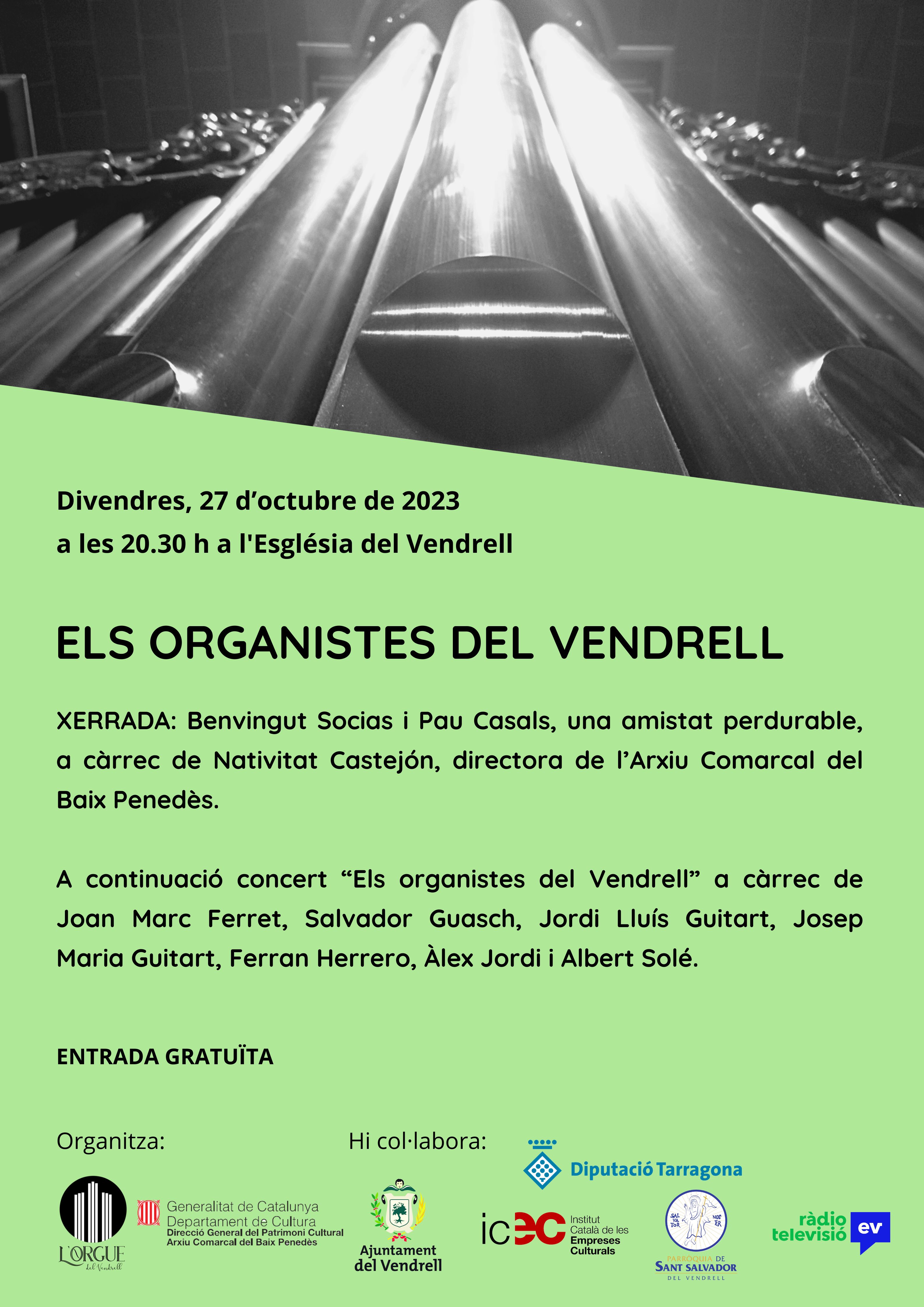 El divendres, 27 d’octubre es farà un concert a l’església del S. Salvador del Vendrell, el que hem anomenat el el Concert d’“els organistes del Vendrell” a càrrec de Joan Marc Ferret, Salvador Guasch, Jordi Lluís Guitart, Josep Maria Guitart, Ferran Herrero, Àlex Jordi, Albert Solé.
