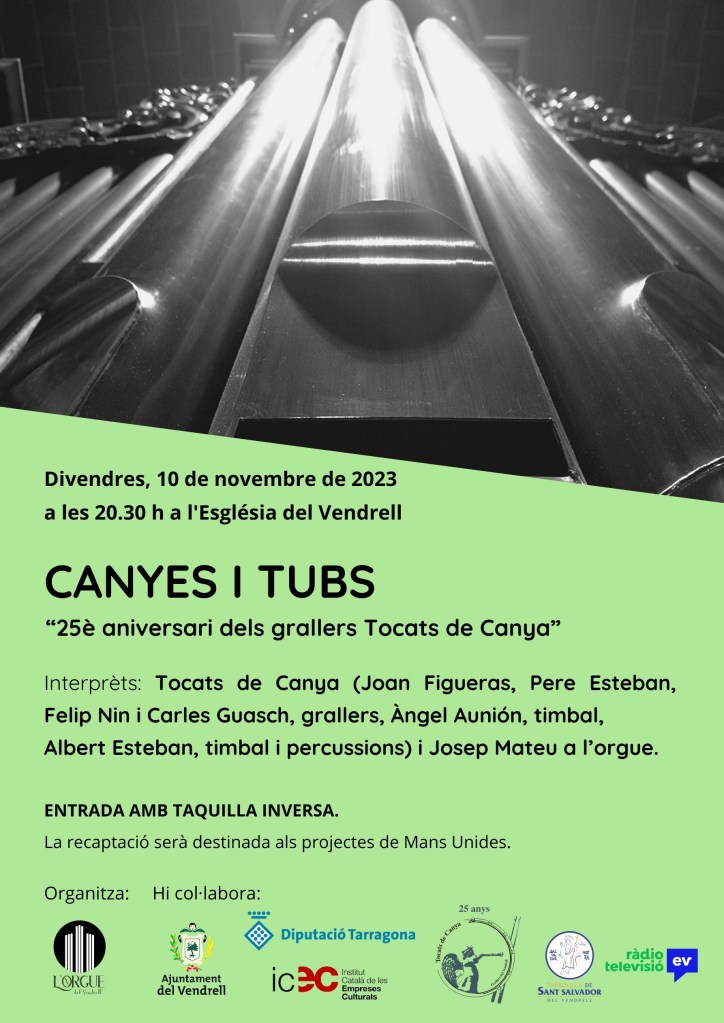 Aquest divendres, dia 10 de novembre de 2023, a les 20.30 h a l’església de Sant Salvador del Vendrell tenim un concert commemoratiu de celebració dels 25 anys del grup de grallers Tocats de Canya.