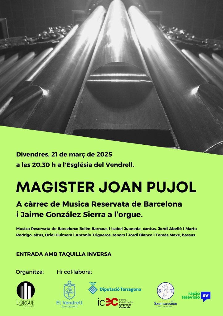 El divendres, 21 de març de 2025 a les a les 20.30 h a l’Església del Vendrell, concert a càrrec de de Musica Reservata de Barcelona i Jaime González Sierra a l’orgue.